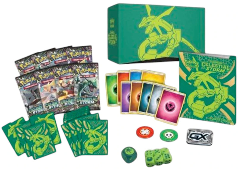 The Pokémon TCG Sun & Moon Celestial Storm Elite Trainer Box is packed with eight Celestial Storm booster packs, 65 card sleeves featuring Rayquaza, 45 Pokémon Energy cards, various Pokémon TCG gameplay accessories, and a code for the online Pokémon card game.