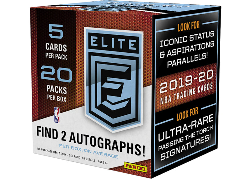 In each 2019-20 Panini Donruss Elite Basketball Hobby Box you will find five cards per pack and 20 packs per box. Typically you will hit two sticker autographs, eight inserts, eight limited print run parallels, and two rookie cards.