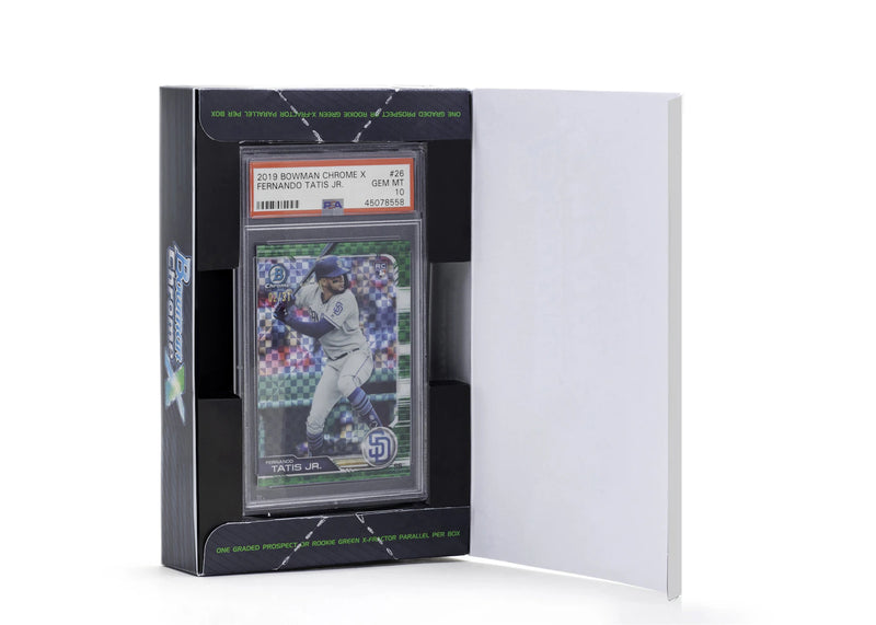 The 2019 Bowman Chrome X Box was initially released on StockX in October 2019 as an IPO (Initial Product Offering). Each box contains one graded prospect or rookie Green X-Fractor...