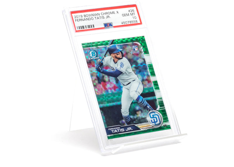 The 2019 Bowman Chrome X Box was initially released on StockX in October 2019 as an IPO (Initial Product Offering). Each box contains one graded prospect or rookie Green X-Fractor parallel numbered to 31. The set has 100 total players on the checklist, 35 rookies and 65 prospects. The checklist includes rookie cards for rising stars, Fernando Tatis Jr., Vladimir Guerrero Jr., Pete Alonso, and Eloy Jimenez.