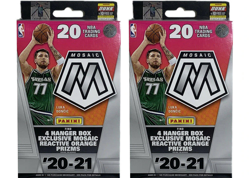 Inside of the 2020-21 Panini Mosaic Basketball Hanger Box you will find 20 cards including four Hanger Box exclusive Mosaic Reactive Orange Prizms.