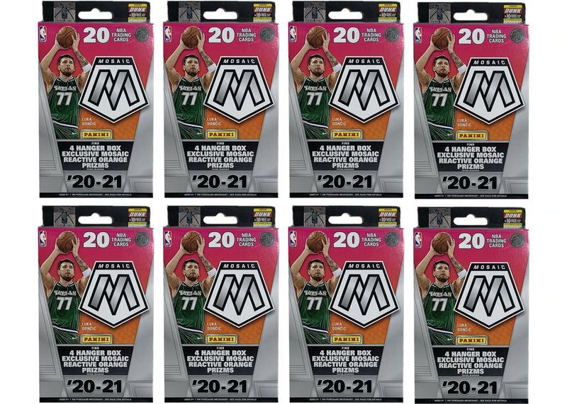 The 2020-21 Panini Mosaic Basketball Hanger Box holds 20 cards including four Hanger Box exclusive Mosaic Reactive Orange Prizm parallels.