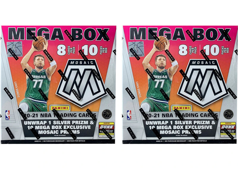 With your purchase, you will receive two (2) 2020-21 Panini Mosaic Mega Boxes with Silver Prizms.