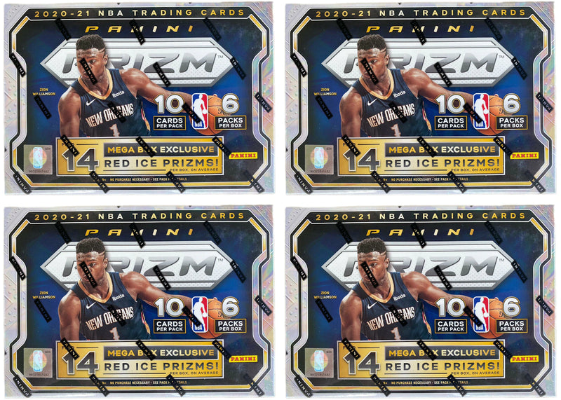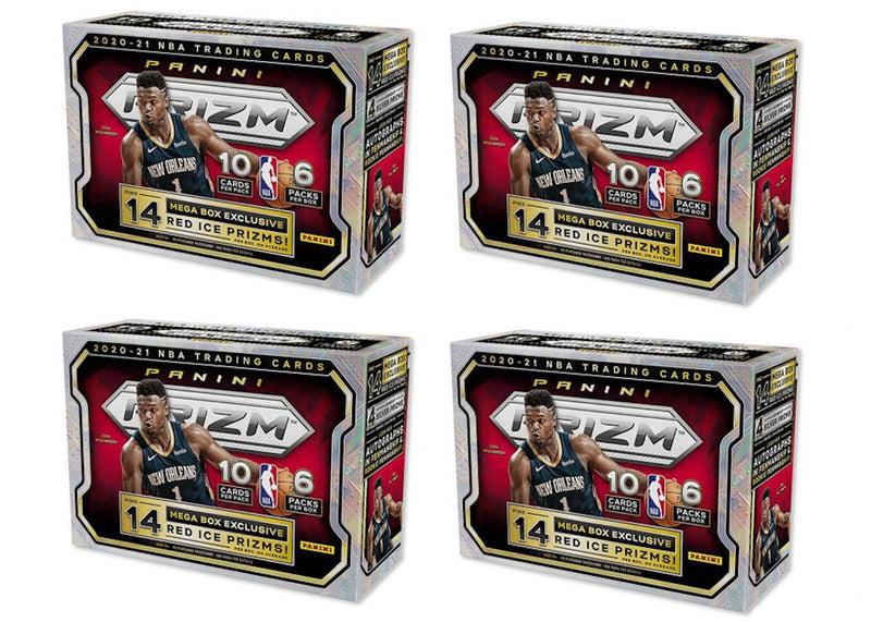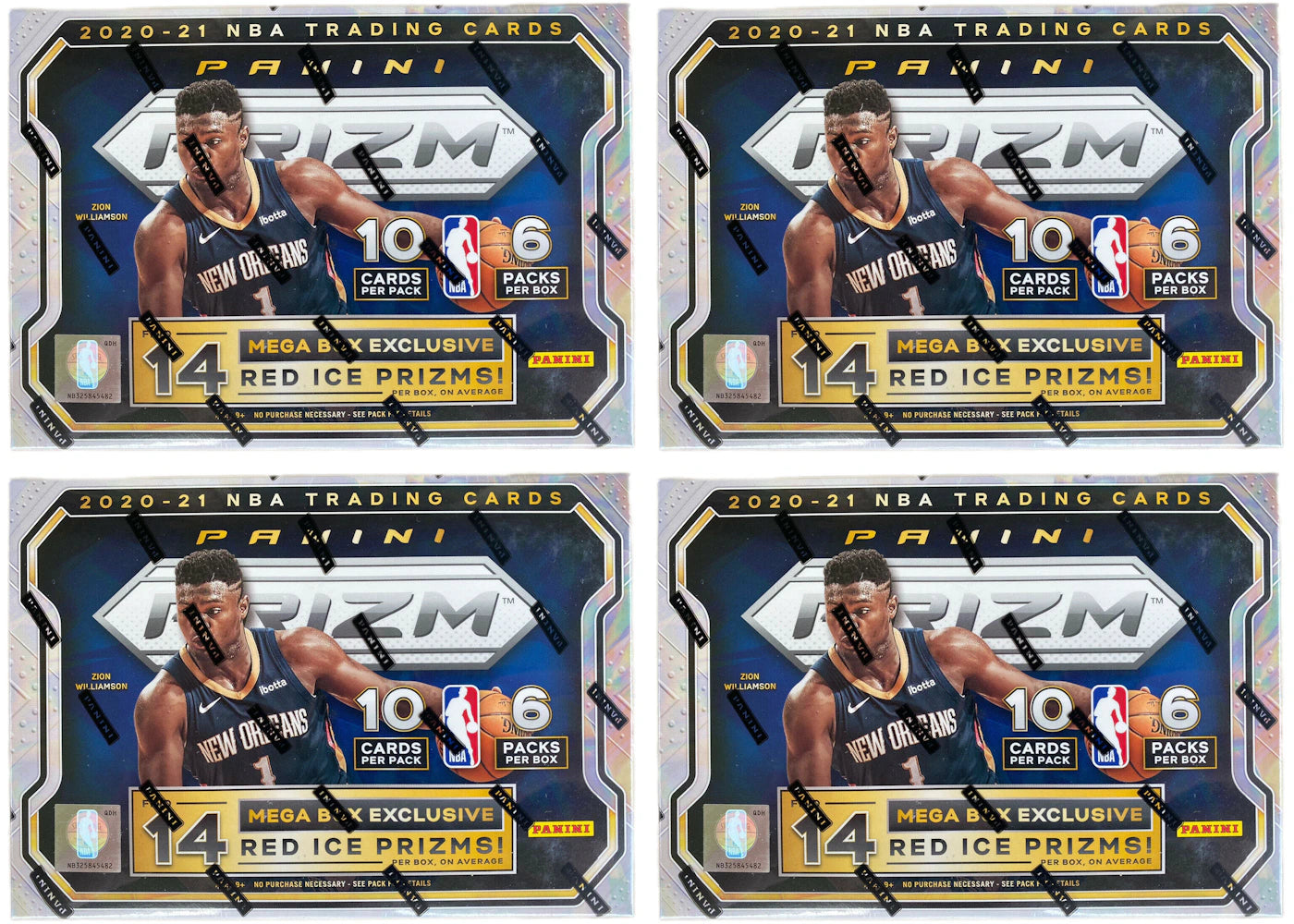 When you purchase this Panini Basketball card product you will receive four (4) 2020-21 Panini Prizm Basketball Mega Boxes (Red Ice Prizms). For more details regarding the 2020-21 Panini PRizm Basketball Mega Box (Red Ice Prizms) click here.