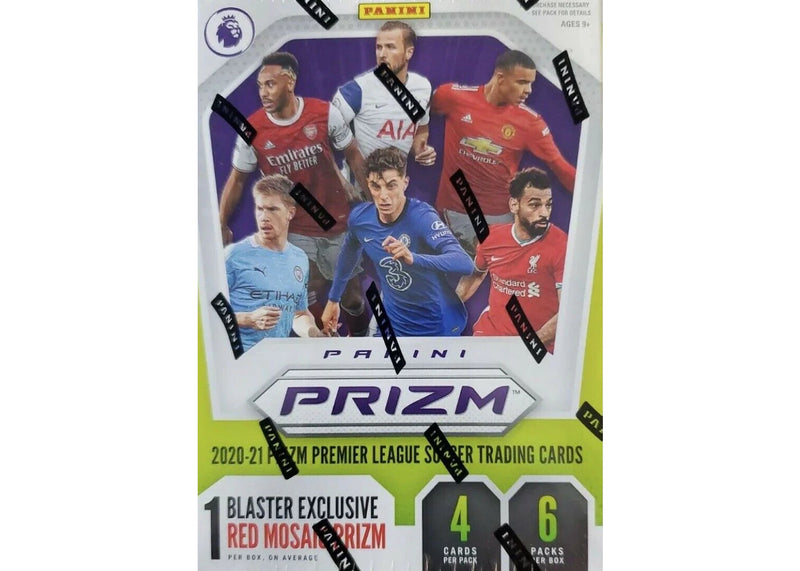 Each 2020-21 Panini Prizm Premier League Soccer Blaster Box comes with 4 cards per pack and 6 packs per box. Inside you will find 1 Red Mosaic Prizm, 2 Green Wave or Silver Prizms, and 2 inserts per box on average. This year's Panini Prizm Premier League set released on March 3, 2021 with Blaster Boxes retailing for $19.99.