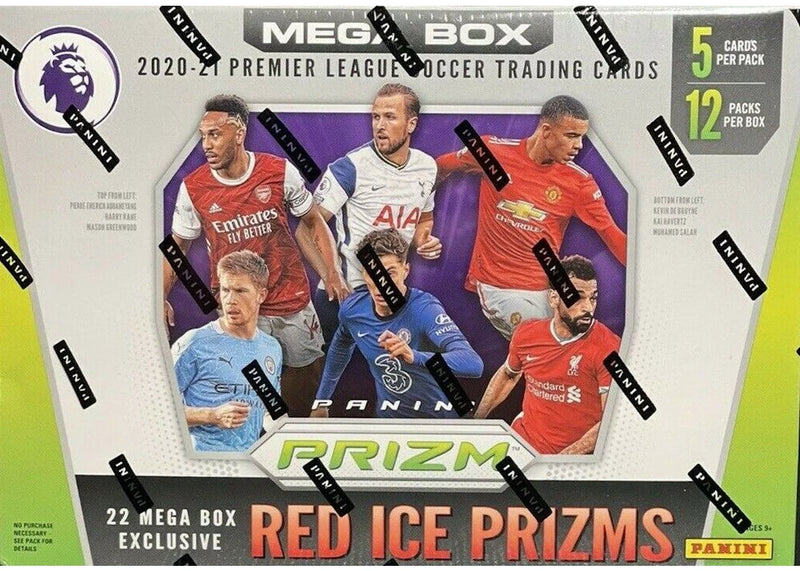 The 2020-21 Panini Prizm Premier League Soccer Mega Box (Red Ice Prizms) brings the popular optichrome look to one of the top soccer league's in the world. The base set checklist totals 300 cards (15 cards from each Premier League team).