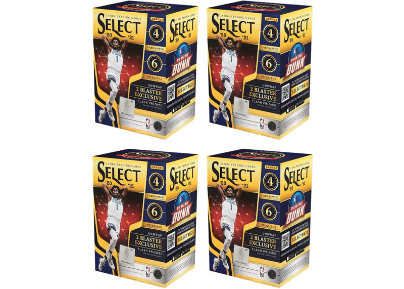 Inside of each 2020-21 Panini Select Basketball Blaster Box you will receive four cards per pack, and six packs per box. On average, you will hit two blaster exclusive Flash Prizms. 2020-21 Panini Select Basketball Blaster Boxes began hitting retail shelves in August 2021. With your order you will receive four (4) 2020-21 Panini Select Basketball Blaster Boxes with Flash Prizms.