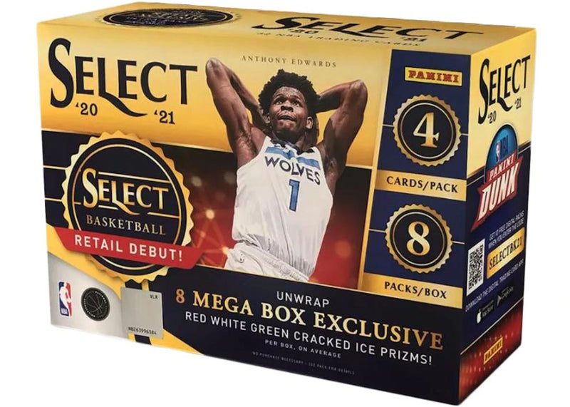 Inside each 2020-21 Panini Select Basketball Mega Box you will find four cards per pack, and eight packs per box with eight of the cards included being MEga Box exclusive Red/White/Green Cracked Ice Prizms. 2020-21 PaniniSelect Basketball Cards began hitting shelves in August of 2021.