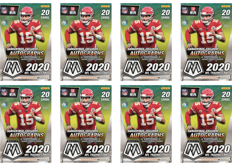 With your order you will receive eight (8) 2020 Panini Mosaic Football Hanger Boxes (Reactive Orange Parallels). For more information regarding this Panini Football card set and box click here.