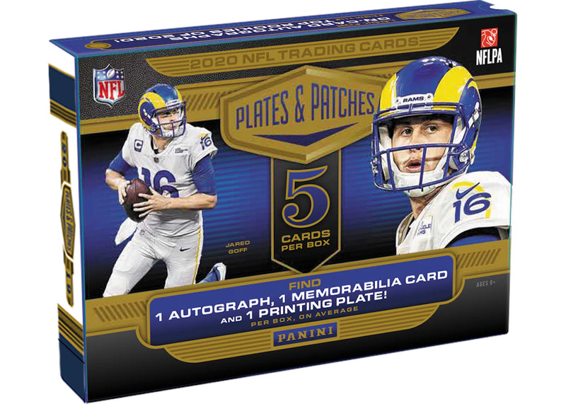 Each 2020 Panini Plates & Patches Football Hobby Box includes 5 cards: 1 Autograph or Patch Autograph, 1 Relic, 1 Printing Plate, 1 Base Card, and 1 Base Parallel.