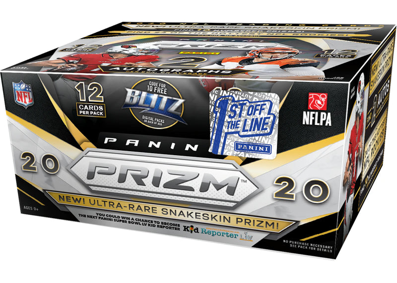 The 2020 Panini Prizm Football 1st Off The Line Box holds 12 cards per pack, and 12 packs per box. Typically you will find one Shimmer Prizm Autograph (#/35 or less), one additional autograph, two Shimmer Prizms (#/35 or less), seven additional numbered Prizms, two Silver Prizms, four Inserts, and 24 Rookie cards.
