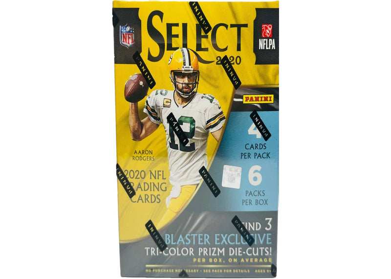 This 2020 Panini Select Football Blaster Box comes with four cards per pack, and six packs per box. Inside you will find three Tri-Color Die Cut Prizms on average.