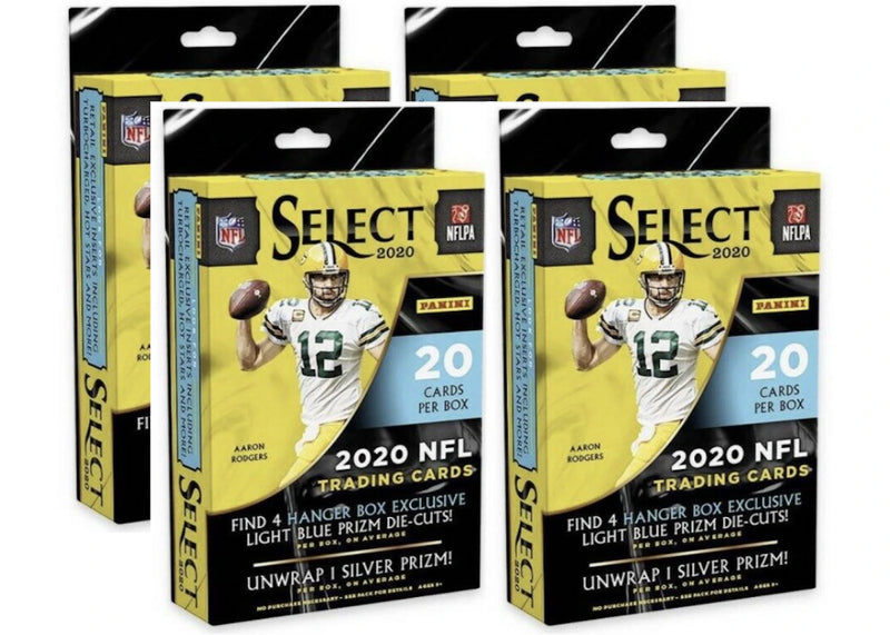 Your order will include four (4) 2020 Panini Select Football Hanger Boxes that contain exclusive Light Blue Die Cut Prizm parallels. For more information on this 2020 Panini Football product, you can click here