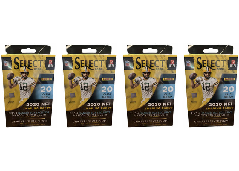With each order of this Panini football card product you will receive four (4) 2020 Panini Select Football Hanger Boxes with Maroon Die-Cuts. For more information on the 2020 Panini Football set and Hanger Box, you can click here