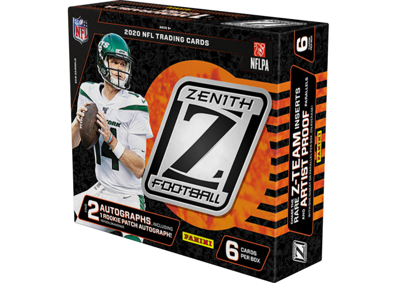 Each 2020 Panini Zenith Football Hobby Box comes equipped with six cards per pack and one pack per box. You can expect to find one Rookie Patch Autograph, and one additional autograph, and one memorabilia card per box on average.