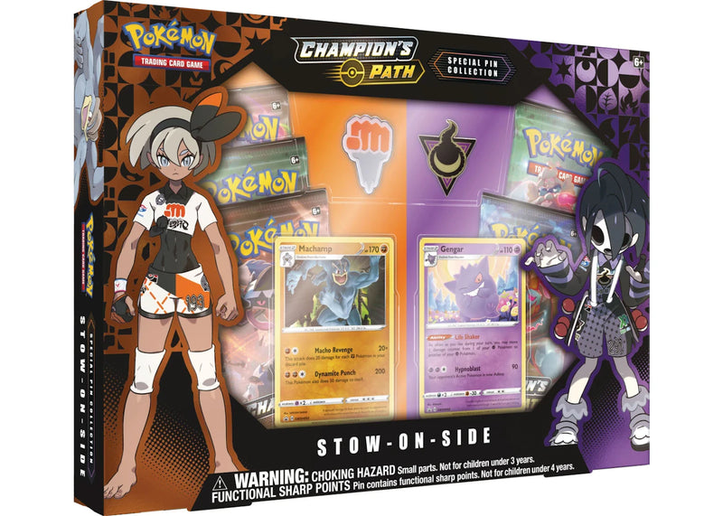 The 2020 Pokemon TCG Sword and Shield Champion's Path Special Pin Collection Stow-On-Side originally released on October 2, 2020. In each box Pokémon card collectors will find two foil promo cards featuring Machamp and Gengar respectively, two collectors pins featuring each gyms logo, five Pokémon TCG Champion's Path booster packs, and a code for the Pokémon card online game.