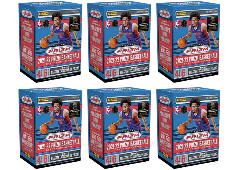 The 2021-22 Panini Prizm - Basketball Blaster Box: Ice Prizms 6x Lot comes with 6 Basketball Blaster Boxes.