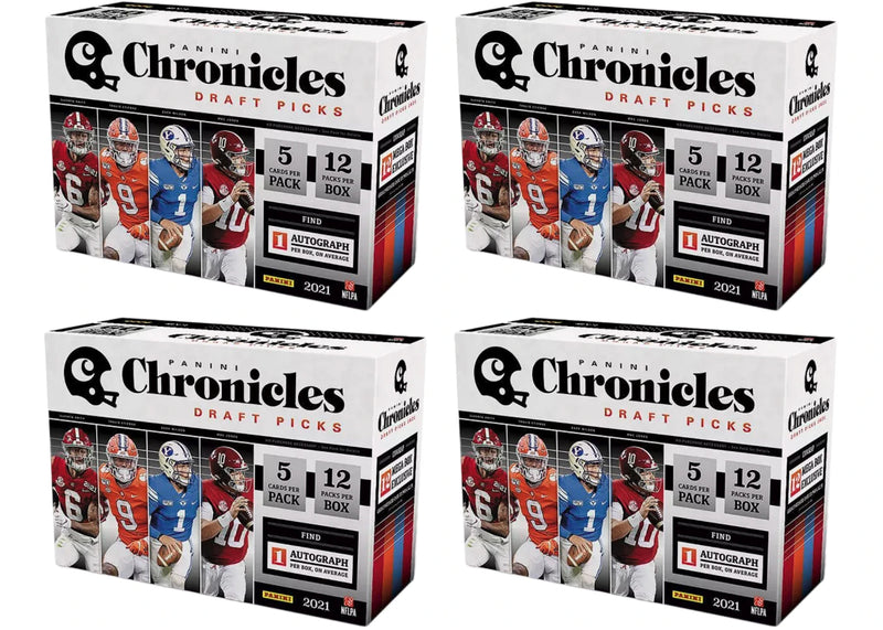 With each order of this Panini football card product you will receive four (4) 2021 Panini Chronicles Draft Picks College Football Mega Boxes with Orange parallels. To see a full description for the 2021 Panini Chronicles Draft Picks College Football Mega Box with Orange Parallels click here.