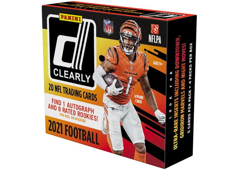 The 2021 Clearly Donruss Football Hobby Box holds five cards per pack, and four packs per box. On average, you can expect to add one autograph, eight acetate Rated Rookies, eight acetate Base Cards, two parallels, and one insert.