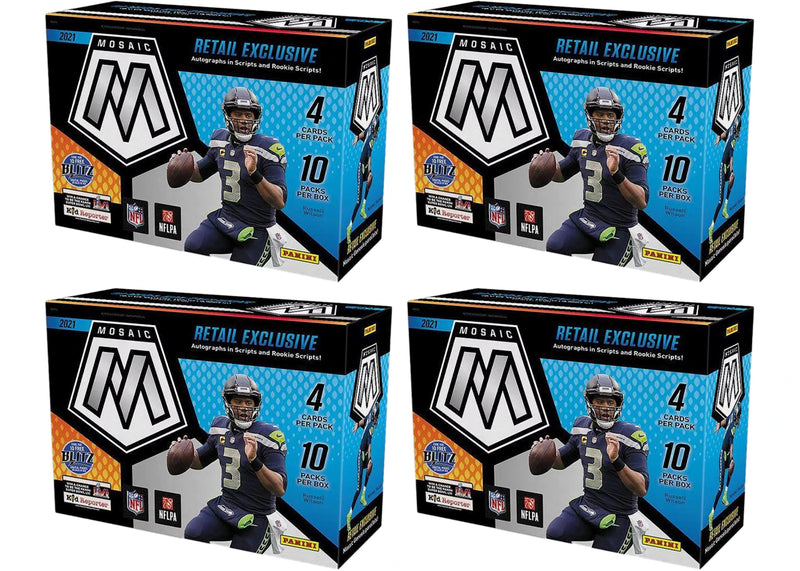 With your order, you will receive four (4) 2021 Panini Mosaic Football Mega Boxes.