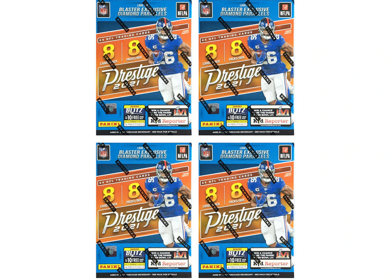 2021 Panini Prestige Football holds a 300 card base set including all of the rookie quarterback talent from the 2021 NFL draft class. Look for Trevor Lawrence, Trey Lance, Justin Fields, Zach Wilson, Mac Jones rookie cards, plus more! Inside each 2021 Panini Prestige Blaster Box you will find eight cards per pack, and eight packs per box. 2021 Panini Prestige Football cards began releasing on July 9, 2021. With your order you will receive four (4) 2021 Panini Prestige Football Blaster Boxes.