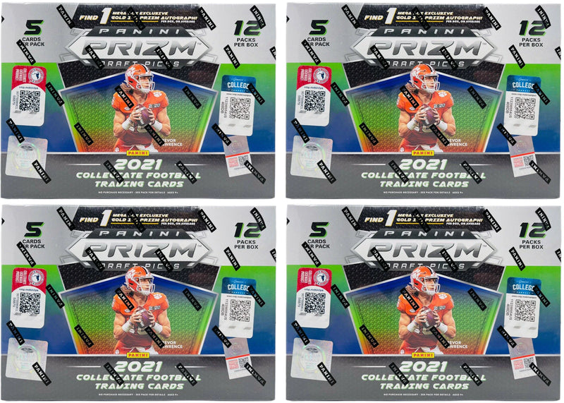 With each order of this Panini Football card product you will receive four (4) 2021 Panini Prizm Draft Picks College Football Mega Boxes with Gold Ice Prizms. For more details on the 2021 Panini Prizm Draft Picks College Football Mega Box and set, click here.