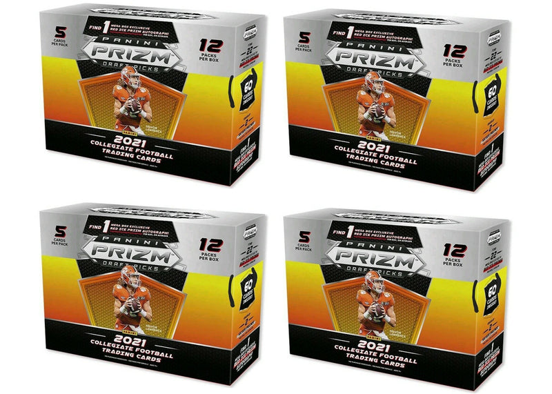 With your order you will receive four (4) 2021 Panini Prizm Draft Picks College Football Mega Box featuring Red Ice Prizms. For a full product description of the 2021 Panini Prizm Draft Picks College Football Mega Box featuring Red Ice Prizms click here.