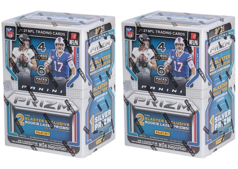 Inside of each 2021 Panini Prizm Football Blaster Box with Lazer Prizms you will find four cards per pack, and six packs per box with two Blaster Exclusive Rookie Lazer Prizms, and one Silver Prizm.