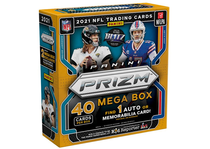 The 2021 Panini Prizm Football Fanatics Mega Box (Purple Pulsars) is a mega box of exclusive sports trading cards featuring players from the American NFL 2021 season.