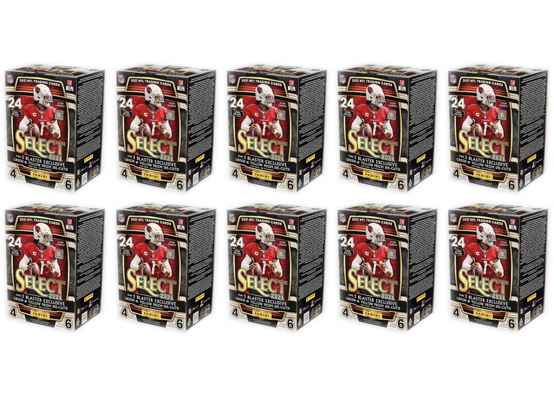 The 2021 Panini Select Football Blaster Box Green Yellow Prizm Die Cuts 10x Lot is made up by a total of 10 Select Football Blaster boxes. Six packs of cards, each containing four cards, are included in each box.