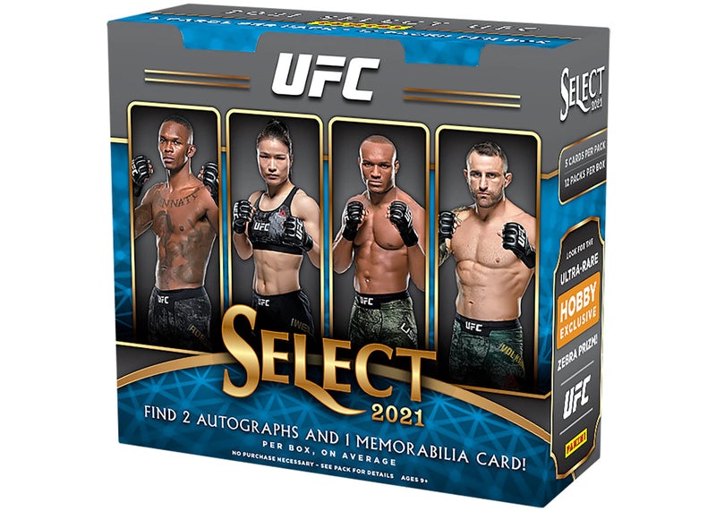 The 2020-21 Panini Select UFC Hobby Box comes with five cards per pack and 12 packs per box. You will typically hit two autographs, one relic, and twelve limited print-run Prizm parallels per box.