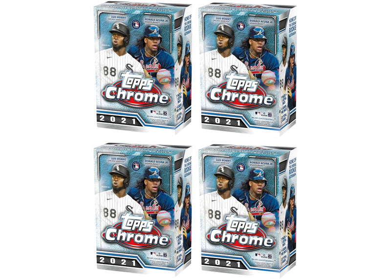 Each 2021 Topps Chrome Baseball Blaster Box comes with four cards per pack and seven packs per box, plus one bonus pack. With your order you will receive four (4) 2021 Topps Chrome Baseball Blaster Boxes. 2021 Topps Chrome Baseball released on August 20, 2021.