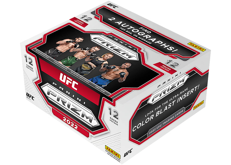 The 2022 Panini Prizm UFC Hobby Box carries twelve cards per pack, and twelve packs per box. Each box holds two autograph cards, on average.