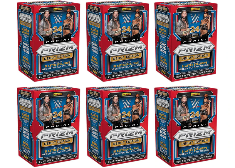 With your purchase, you will receive six (6) 2022 Panini Prizm WWE Wrestling Blaster boxes. For more information on the 2022 Panini Prizm WWE set and the contents of the blaster box click here.