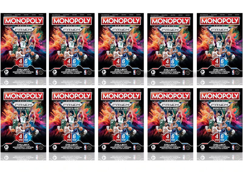 The 2023-24 Panini Prizm Monopoly NBA Booster Box 10x Lot is a set of NBA trading cards that include stars of the 2023-2024 season, such as LeBron James, Stephen Curry, and Zion Williamson.
