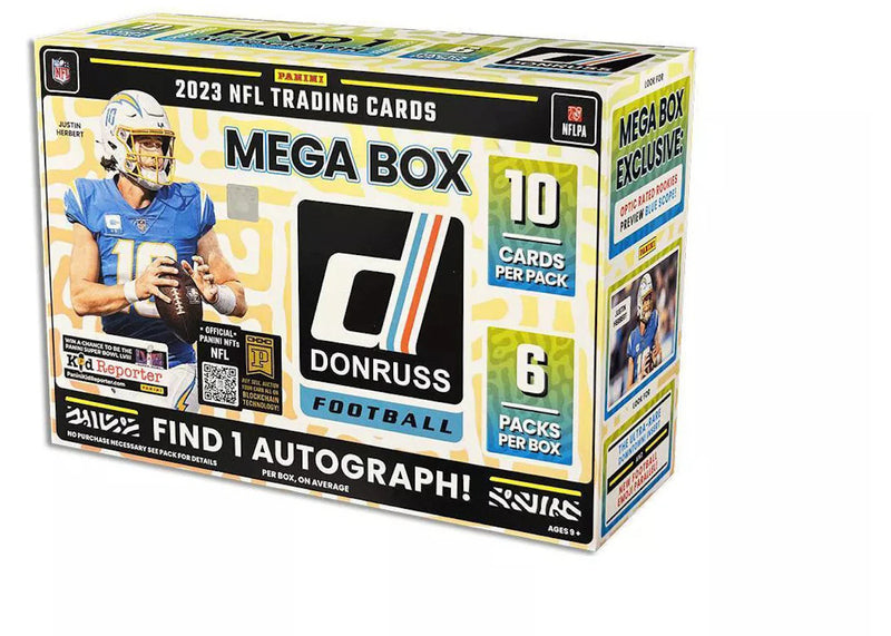 What cards are you after? Will there be an optic blue scope-rated rookie? Open this Mega Box from Panini Donruss featuring 2023 NFL players and rookies, and find out what awaits you. The high-quality trading cards in this box are a must-have for sports collectors and sports trading card collectors, and great for trading with other enthusiasts. On average, you will find one autograph per box. Justin Herbert’s photo is on the box itself.