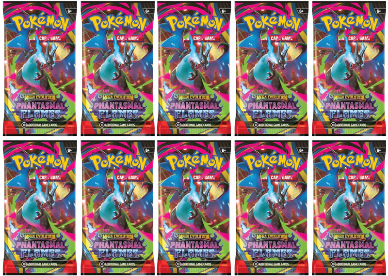 The 2025 Pokémon Mega Evolution Phantasmal Flames Mega Charizard X Booster Pack 10x Lot is now available at Side Kicks!