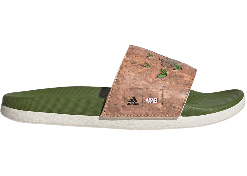 The adidas Adilette Comfort Slides Marvel Off White Core Black Tech Olive (GS) is now available at Side Kicks!