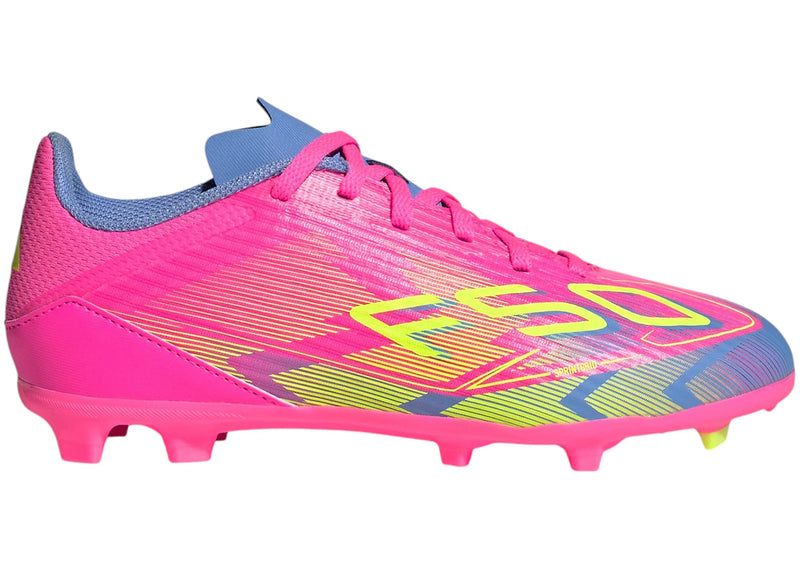 The adidas F50 League FG/MG Lucid Pink Lucid Lemon Blue Fusion (Kids) is now available at Side Kicks!