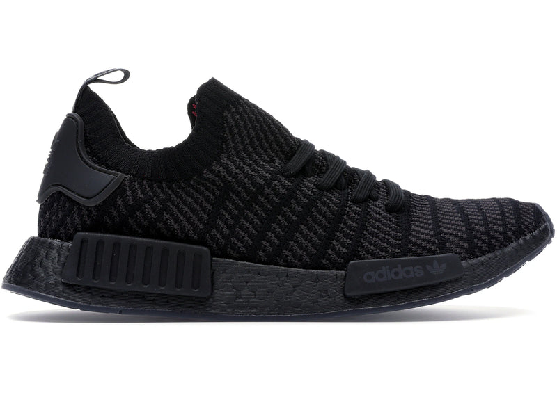 The adidas NMD R1 STLT Triple Black combines dual black tones with a Primeknit upper and full-length rubber outsole. A Boost midsole with black underfoot and matching EVA plugs provides cushioning. The sock-like collar includes subtle pink accents, while the adidas logo is printed on the midsole.