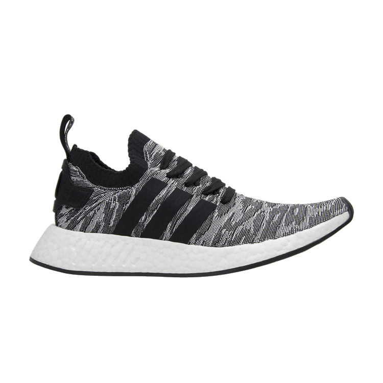 The adidas NMD R2 Black White Future Harvest features a PrimeKnit upper for lightweight breathability and a snug fit. A heel pull tab adds convenience, while the sock-like construction minimizes seams. The Boost-cushioned midsole delivers responsive energy return, supported by stabilizing EVA inserts. Released on July 13, 2017, the adidas NMD R2 Black White Future Harvest is available now at Side Kicks.