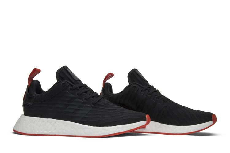 The adidas NMD R2 Core Black Red features a black Primeknit upper with red heel tab and outsole accents. It includes a Boost midsole for responsive cushioning and a rubber...