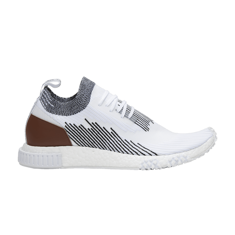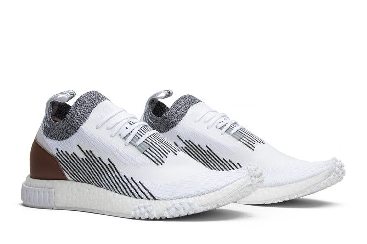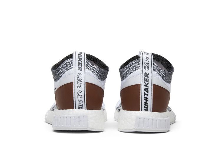 The adidas NMD Racer Whitaker Group features a white Primeknit upper with reinforced weaving at the toe and ankle. Black embroidered motion blur patterns appear on the sides and under...