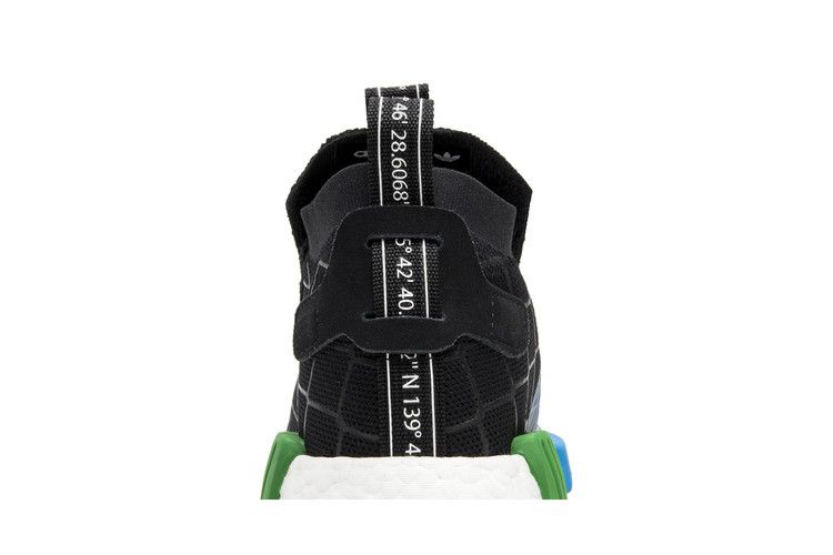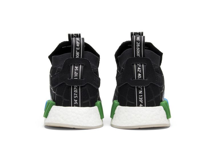 The adidas NMD TS1 mita Cages and Coordinates features a black PrimeKnit upper with a chain-link fence pattern and white sole for contrast. The Boost-cushioned midsole includes EVA plugs for support, while geographic coordinates on the heel and tongue tabs highlight the Adidas-Mita collaboration. A foldable tongue covers the laces for a streamlined look. Released on July 7, 2018, the adidas NMD TS1 mita Cages and Coordinates is available now at Side Kicks.