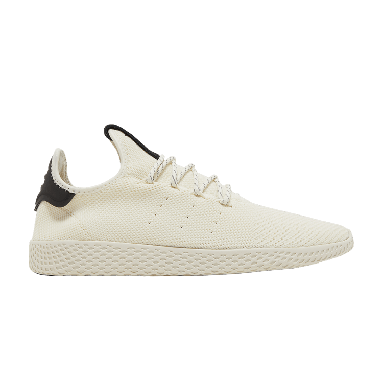 The adidas Tennis Hu Pharrell Williams Triple White is a collaborative design featuring a cloud white, cloud white, and chalk white colorway. The upper is made of breathable mesh for lightweight comfort, while the lace-up closure ensures a secure fit. A cushioned EVA midsole provides responsiveness, and the textured outsole delivers traction. Branding includes Pharrell Williams details on the heel and the adidas Trefoil logo on the tongue. Released on June 14, 2018, the adidas Tennis Hu Pharrell Williams Triple White is available now at Side Kicks.
