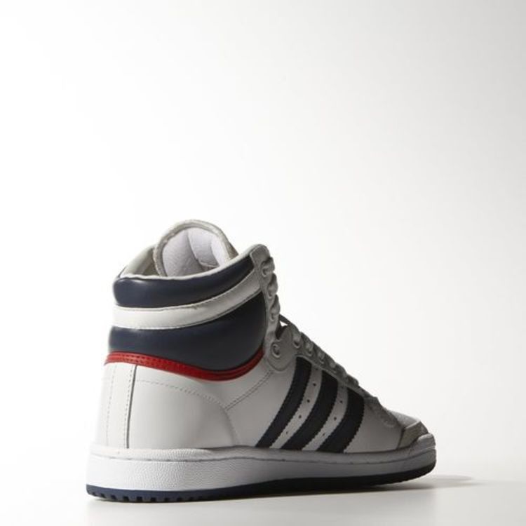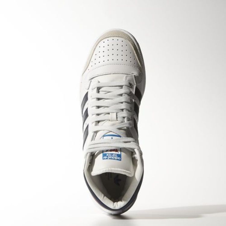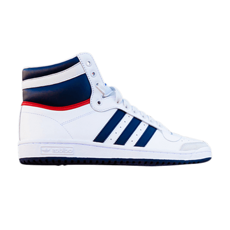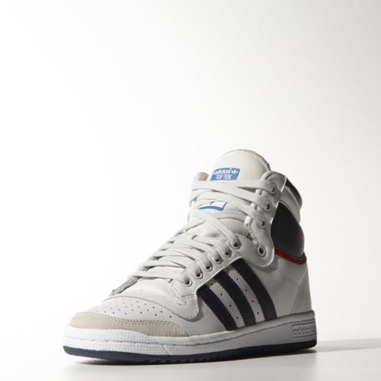 The adidas Top Ten Hi 40th Anniversary 2019 features a white leather upper with black accents on the stripes, heel tab, and tongue. It includes the iconic adidas logo on...