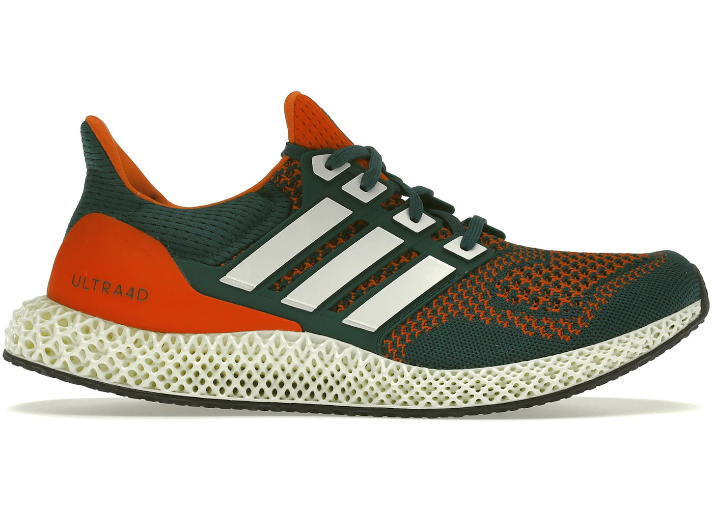 The adidas Ultra 4D Miami Hurricanes features a green and orange Primeknit upper with black heel and tongue accents. Its 4D midsole uses a lattice structure for responsive cushioning, paired with a Continental rubber outsole for traction. Released on September 23, 2021, the adidas Ultra 4D Miami Hurricanes is available now at Side Kicks.