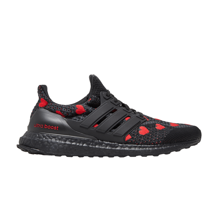 The adidas Ultra Boost 5.0 DNA Valentine's Day features a breathable, lightweight synthetic upper with a supportive TPU cage for a secure fit. The black and Vivid Red design includes heart details for Valentine's Day. Boost technology and a Torsion System midsole provide cushioning and arch support, while the Continental Rubber outsole offers traction. Released on January 19, 2022, the adidas Ultra Boost 5.0 DNA Valentine's Day is available now at Side Kicks.