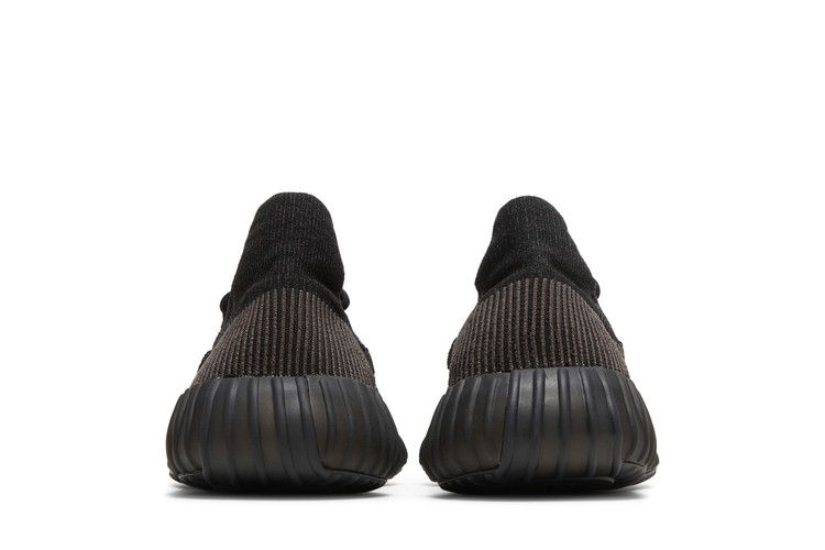 The adidas Yeezy 350 V2 CMPCT Slate Carbon has a sock-like black and Slate Carbon Primeknit upper with raised collars and woven eyelets. Light brown accents provide subtle contrast against the dark design. A full black Boost sole delivers cushioning and support.