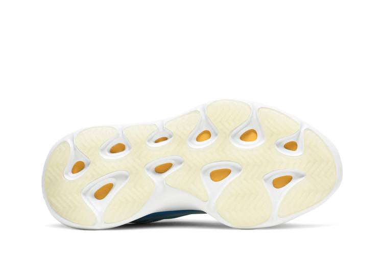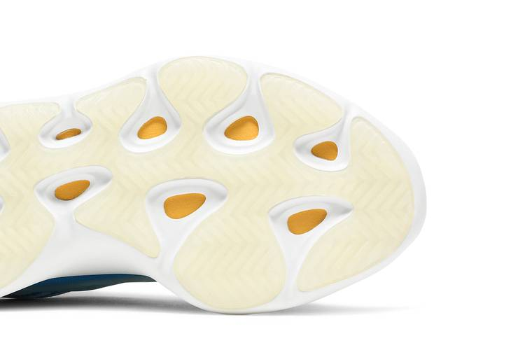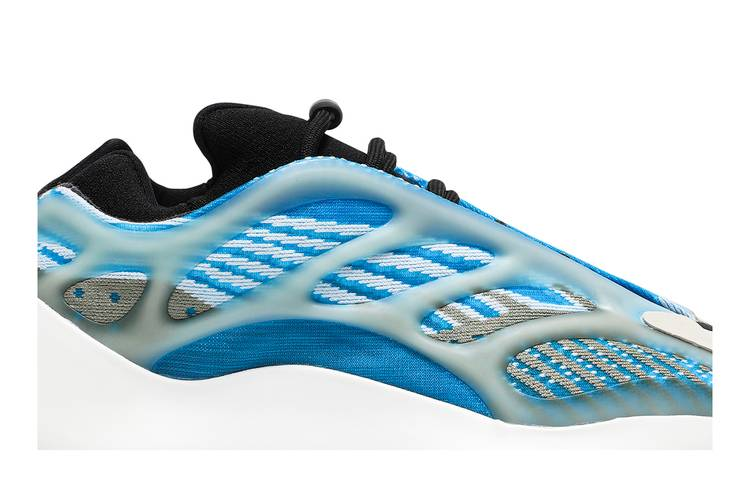 The adidas Yeezy 700 V3 ‘Arzareth’ showcases vibrant blue tones on a breathable knit upper with a semi-translucent RPU cage for structure. The bootie-style collar offers a snug fit, while the PU encapsulated EVA midsole provides cushioning. A herringbone rubber outsole ensures traction. Extra laces required. Released in August 2020, this design introduces a new color palette to the Yeezy line, featuring a blue and grey Primeknit upper with a glow-in-the-dark cage overlay.